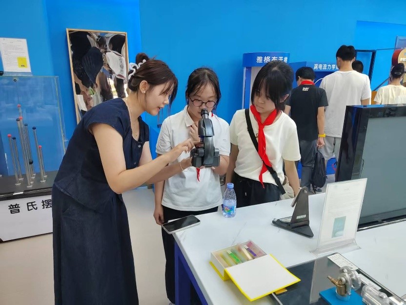 讲座后,学生们参观了江苏省科普教育基地——888集团6008物理探索科普馆。在支部党员和大学生志愿者的讲解指导下,学生们亲手操作了“混沌摆”、“窥视无穷”、“无线充电”等物理实验设备,在互动体验中感受物理奥秘。